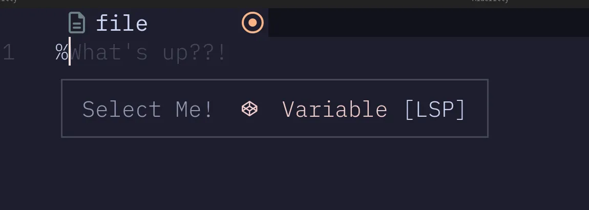 Type % in your editor, and the autocomplete popup appears. label is what shows in the list, detail is the ghost text next to it, and insert_text is what actually gets written into your file when you accept the suggestion.