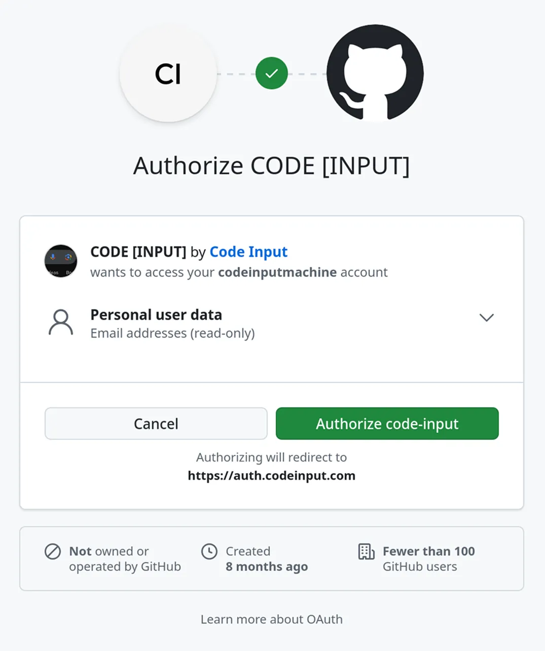 - You'll be redirected to GitHub to authorize the CodeInput OAuth application