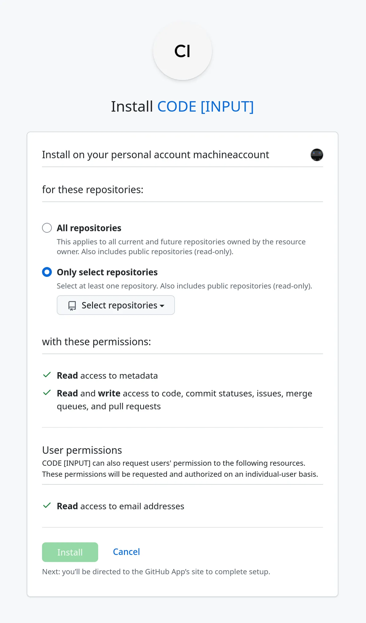 After authorizing, you'll install the GitHub App on your organization or personal account. This determines which repositories CodeInput can access.